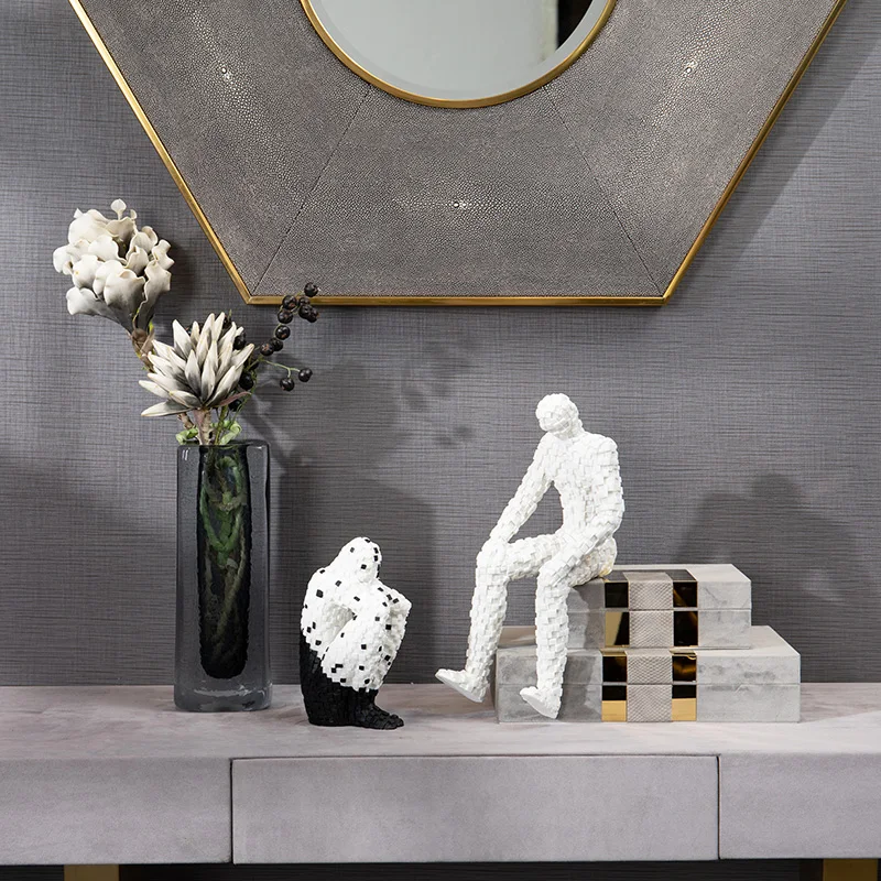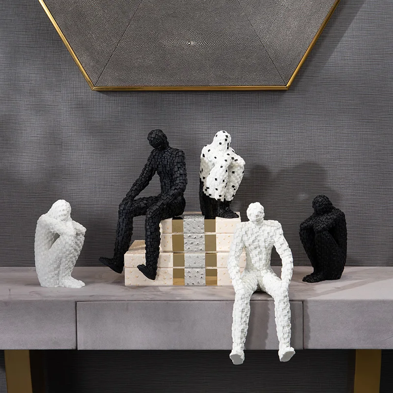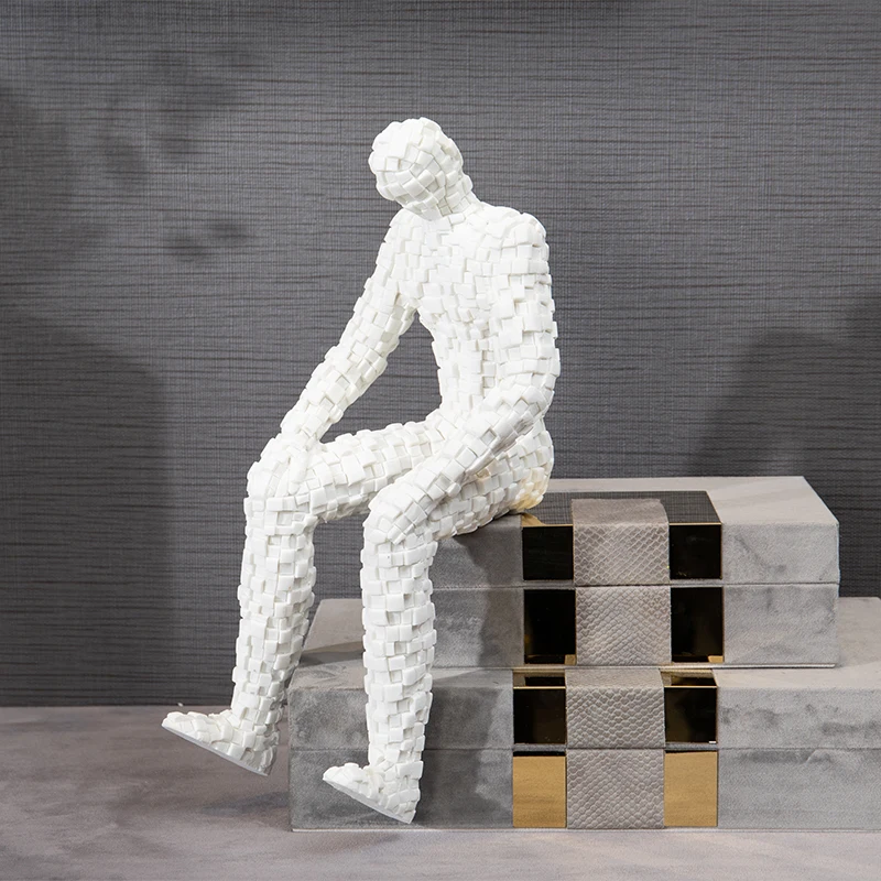 Hot Sale Creative Abstract Black White Thinking Figure Sitting Next To Mosaic Stone Rock Mosaic Statue Home